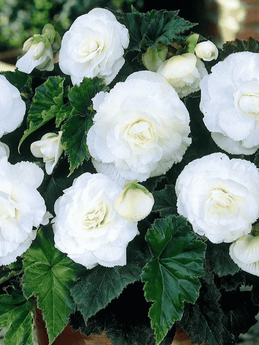 Бегония Double White пленяет взор своей изысканной красотой и нежностью форм. Это компактное растение с прямостоячими стеблями высотой до полуметра украшено крупными сердцевидными листьями насыщенного зелёного цвета, слегка волнистыми по краям и покрытыми тонким бархатистым пушком. Особенное очарование растению придают пышные махровые цветки белоснежного оттенка, собранные в крупные соцветия, словно облачные шапки, возвышающиеся над лиственной массой. Цветение продолжается длительное время, радуя глаз яркими красками даже в условиях полутени. Бегония предпочитает влажную почву и умеренную температуру воздуха, легко адаптируется к домашним условиям и широко используется в декоративном озеленении интерьеров и садов, создавая атмосферу утончённости и гармонии природы.