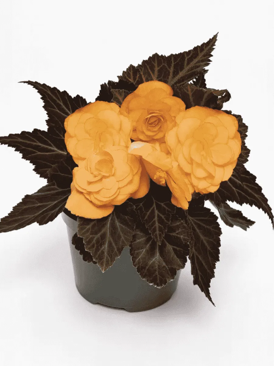 Бегония клубневая сорта *GO! Early Cherry Bronze Leaf* пленяет взор роскошной бронзово-зелёной листвой с бархатистым отливом и нежным пурпурным крапом, придающим ей изысканный благородный шарм. Листья крупные, сердцевидные, слегка волнистые по краям, словно вырезанные искусным мастером, создают живописную композицию, подчёркивая утончённую красоту цветка. Цветки яркие, насыщенно-алого оттенка, напоминают миниатюрные розы, собранные в пышные соцветия, украшающие растение с ранней весны до поздней осени. Компактная форма куста позволяет использовать её как эффектное украшение контейнерных композиций, балконных вазонов и клумб, где она неизменно привлекает внимание своей элегантностью и декоративностью.