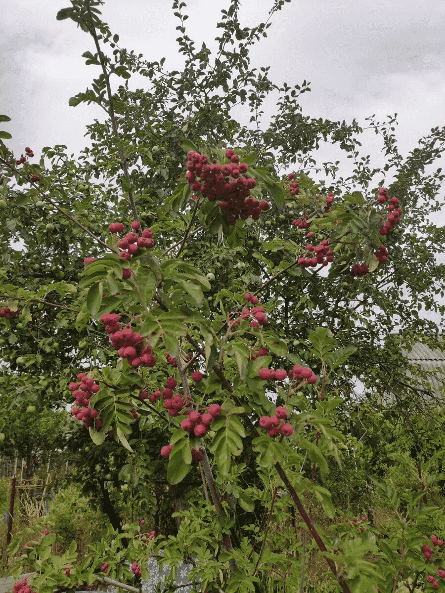 Рябина сладкоплодная 'Титан' — стройное дерево средней высоты с раскидистой кроной, украшенной густой листвой насыщенного зелёного цвета, приобретающей осенью яркие оттенки оранжевого и красного. Листья крупные, перисто-сложные, состоят из множества узких листочков с зубчатыми краями, придающих растению особую декоративность. Цветёт обильно белыми ароматными соцветиями-зонтиками, привлекающими внимание своей нежностью и воздушностью. Растение отличается быстрым ростом, устойчивостью к неблагоприятным условиям среды и неприхотливостью в уходе, прекрасно адаптируясь даже в городских условиях. Благодаря своим привлекательным внешним качествам и способности украшать садовые композиции, рябина 'Титан' становится желанным гостем садов и парков, даря радость глазу и душу каждому, кто её увидит.